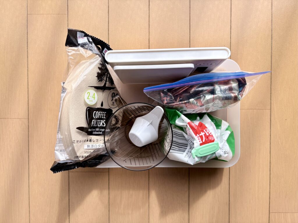 例えば、最近インスタントコーヒーだったのをやめて、ドリップコーヒーを始めました。まず、 私は、無印良品の「再生ポリプロピレン入りメイクボックス 1/4」を住所にしました。この小さな箱に収まるドリッパーと、あらかじめ挽かれたコーヒー。まずはこの二つだけ。自分ルールです。